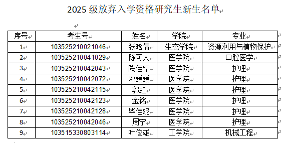 2025级研究生新生张晗倩等9人申请放弃入学资格,根据《丽水学院硕士研究生学籍管理实施细则》(丽学院办〔2022〕18号)第二章第三条规定,张晗倩等9名研究生按放弃入学资格处理,具体名单见下表。