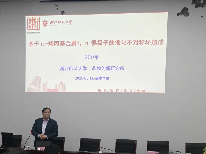 邓卫平教授以《基于π-烯丙基金属1,n-偶极子的催化不对称环加成》为主题,介绍π-烯丙基金属的催化不对称环加成,是构建杂环骨架的高效且高选择性合成策略。他通过将结合学科发展历程中的关键事件与生动故事,系统介绍杂环结构的研究思路与多样化构建方法,在回顾科学探索历程的同时,展现杂环化学的独特魅力与广阔应用前景。讲座内容深入浅出,让在场的研究生感受到了科研的魅力与挑战。